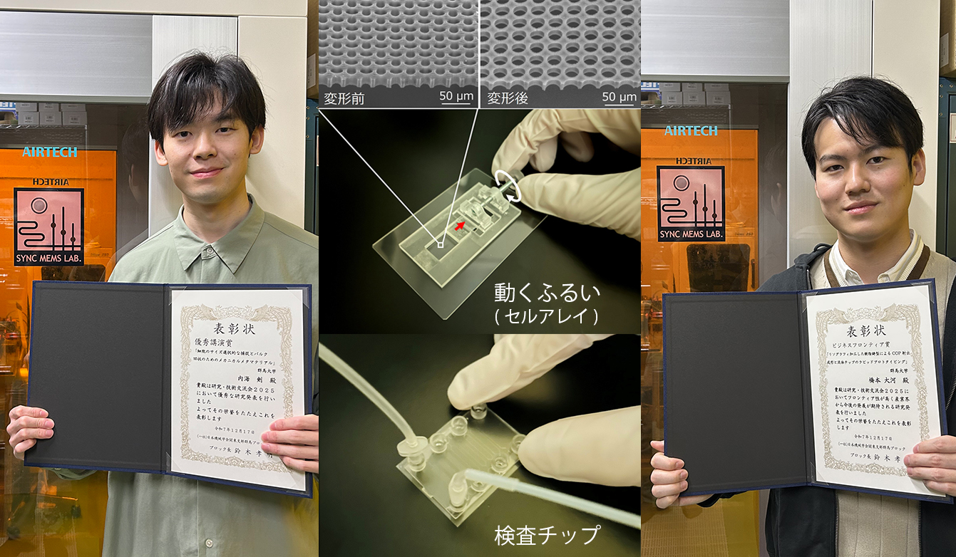 2025年12月17日に群馬大学桐生キャンパスで開催された、日本機械学会関東支部群馬ブロック「研究・技術交流会2025」において、大学院理工学府知能制御プログラム・マイクロナノ工学研究室所属の学生2名が、その優れた研究成果を評価され受賞しました。