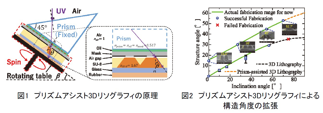本研究では、従来の3次元リソグラフィ技術における物理的限界(構造角度約35度以下)を打破する「プリズムアシスト法」を提案し、加工プロセスの最適化と、光学・エネルギーデバイスへの応用実証に取り組んだ。