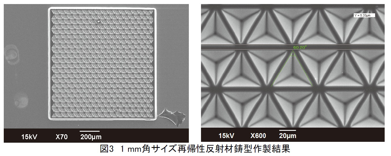 応用の一環として、入射した光を光源方向に反射する「再帰性反射構造(コーナーキューブアレイ)」の作製を行った。再帰性反射を効率的に生じさせるためには、35.3度という精密な構造角度が必要となるが、本手法を用いることで誤差わずか1.1%(実測34.9度)という極めて高い精度で鋳型を実現した。さらに、この鋳型からシリコンゴムや、応用例として「可食材料(飴)」への形状転写にも成功した。光学評価の結果、作製したデバイスが広範囲の入射角に対して高い反射輝度を維持することを確認し、食品管理や高度な偽造防止マーカーとしての有用性を示した。
