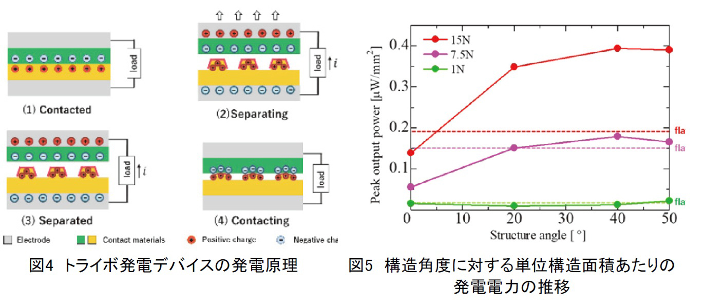 もう一つの応用例として、振動を電力に変換する摩擦発電デバイス(TENG)の性能向上に取り組んだ。接触界面に広角(〜50度)のマイクロピラミッド構造を導入し、構造角度が発電特性に与える影響を評価した。解析の結果、発電電力は有効接触面積の増加に伴い向上するが、構造角度40度において単位面積あたりの電力が極大値をとることがわかった。これは、傾斜角増大による側面積の増加と表面積あたりの接触効率のバランスが、40度付近で最適化されることを示唆している。界面構造の「角度」という新しいパラメータの導入により、TENGの出力設計指針を明確化した。